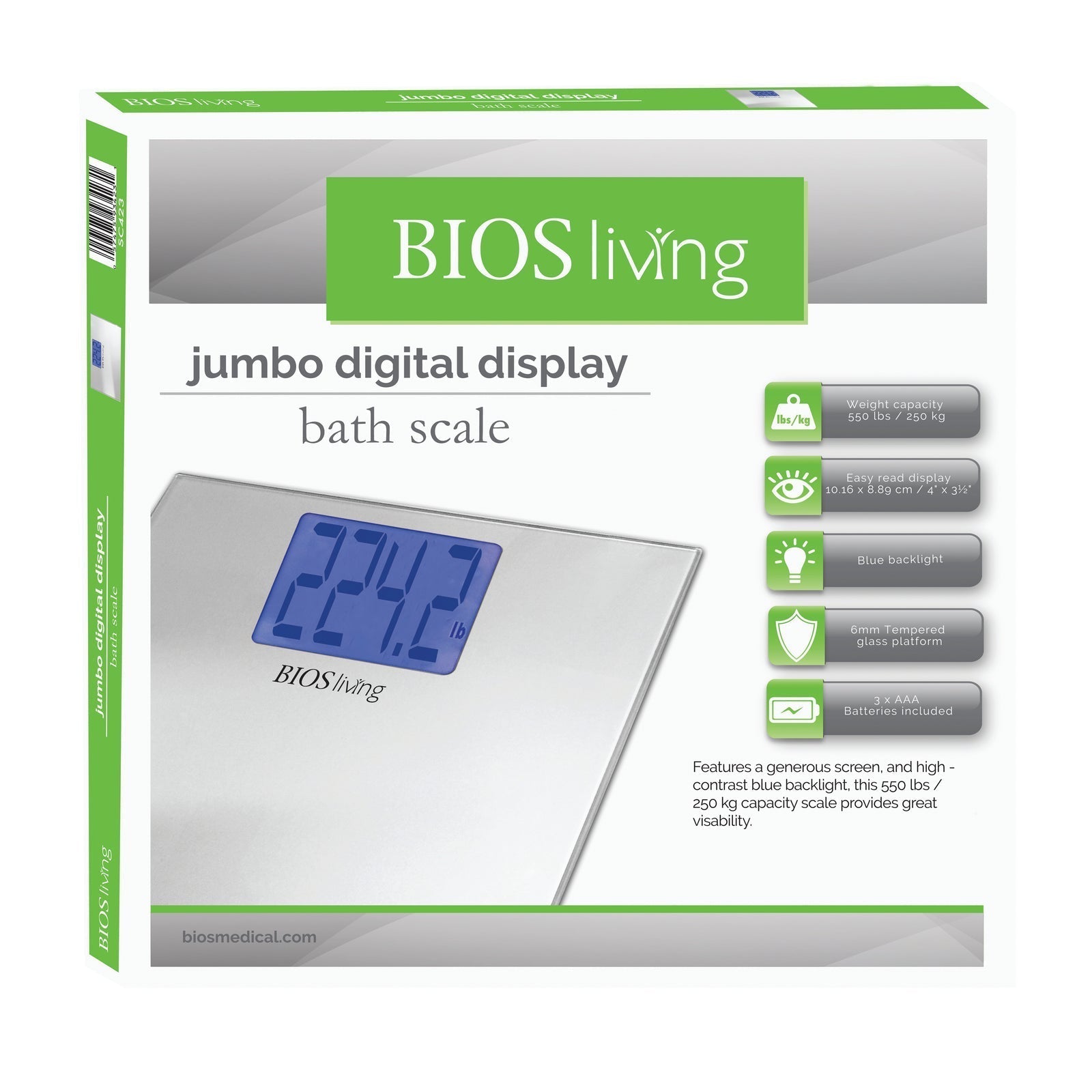 The Jumbo Digital Display Bath Scale allows you to weigh yourself in complete confidence. The sturdy high quality glass platform has a weight capacity of 550LBS and features and large LCD screen for those who have difficulty seeing over their body. The blue backlit design caters to those who are vision impaired and need a bit of extra help seeing the screen.Learn more
