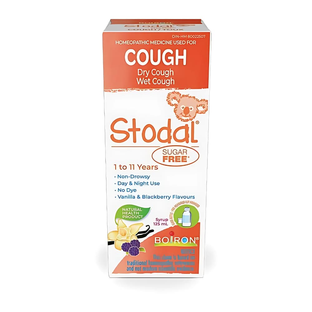 Children's Stodal® Sugar-Free Homeopathic Syrup is designed to relieve dry or wet cough in children aged 1 to 11 years. This syrup does not cause drowsiness and contains no dextromethorphan, diphenhydramine, or guaifenesin. It is sucrose-free, using maltitol and sorbitol as sugar substitutes. The recommended dosage is 5 ml orally, using the provided measuring cup, three times a day. Doses should be reduced as improvement is observed. It should not be administered to children weighing less than 8 kg (17 pounds). This product is available in a 125 ml bottle, with vanilla and blackberry flavors, and contains no dyes. For more information, please visit Boiron's official website.
