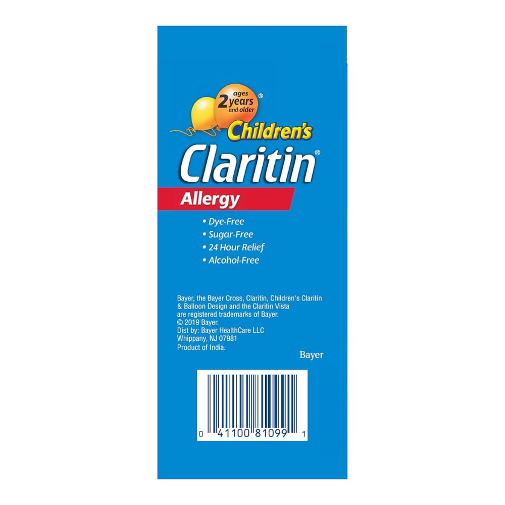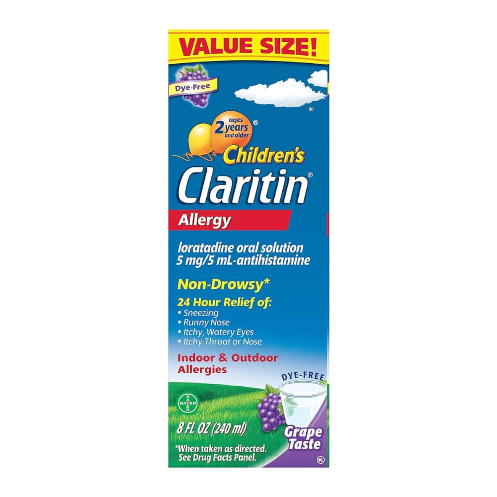 Claritin Kids Allergy Medicine is a grape-flavored antihistamine syrup formulated to provide 24-hour non-drowsy relief for children over 2 years old. Each 5 ml contains 5 mg of loratadine, which helps alleviate seasonal allergy symptoms such as sneezing, runny nose, watery eyes, and itching of the nose or throat. The syrup is free from dyes, sugar, and alcohol, and is kosher certified. The recommended dosage is 5 ml once daily for children aged 2 to 5 years, and 10 ml once daily for children aged 6 and above. It's important to follow the package instructions and consult a healthcare professional before use, especially if the child has pre-existing medical conditions or is taking other medications.