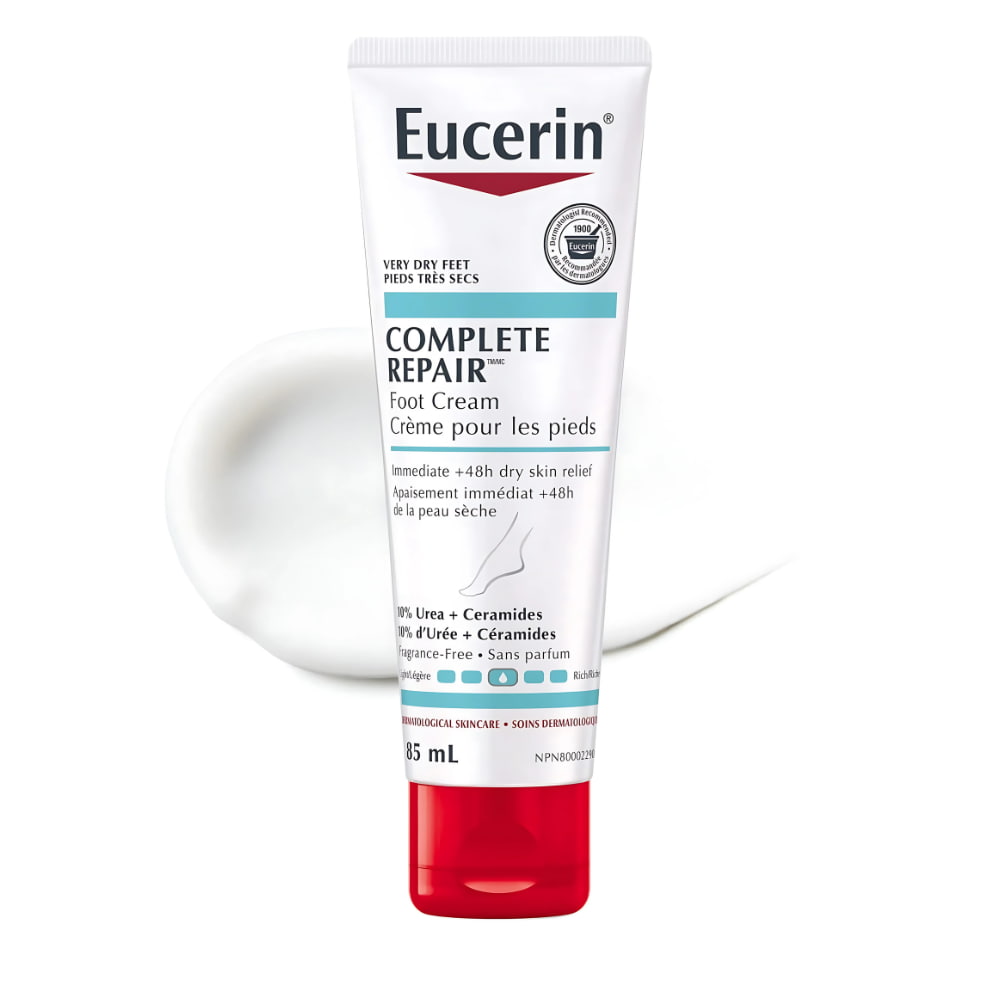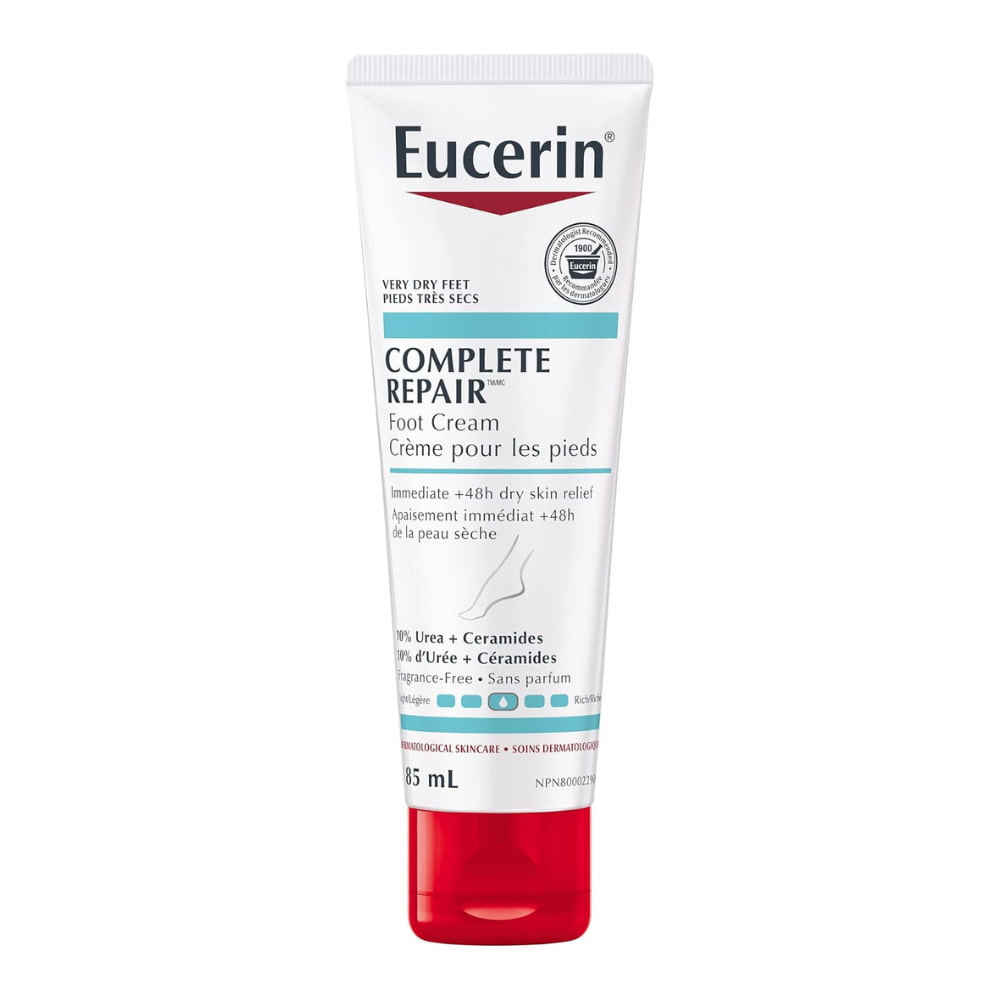 La Eucerin Complete Repair Daily Moisturizing Foot Cream for Very Dry, Rough Skin is an over-the-counter treatment designed to exfoliate and intensely moisturize very dry and rough feet and heels. It contains 10% urea, a humectant that attracts and retains moisture in the skin, helping to soften and smooth rough skin. Additionally, it includes ceramides that strengthen the skin barrier and gluco-glycerol that enhances skin hydration. This cream is clinically proven to immediately relieve very dry and rough skin for 48 hours, leaving feet looking and feeling smooth and healthy. It is suitable for adults and is available in 85 ml tubes.