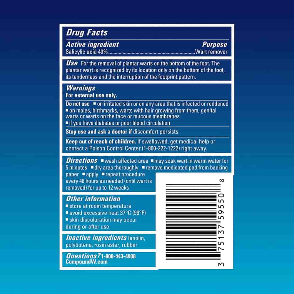 Compound W Maximum Strength One Step Plantar Foot Pads is an over-the-counter treatment designed to effectively remove plantar warts. Each pad contains 40% salicylic acid, which helps to gradually dissolve the wart tissue. These pads are self-adhesive, waterproof, and feature extra padding for comfort during treatment. The package includes 20 pads, suitable for multiple applications. It is suitable for adults and children ages 3 and up.
