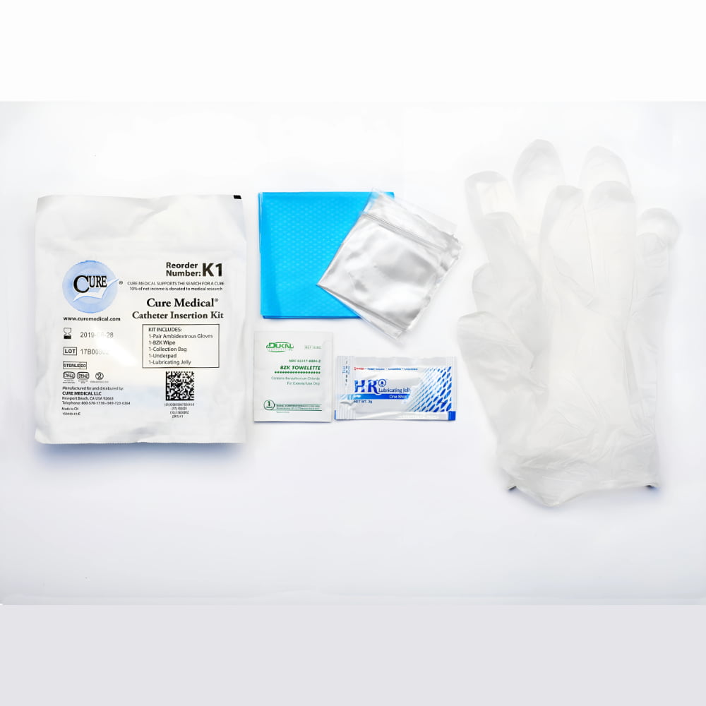 The Cure Medical® Catheter Insertion Kit is a sterile, single-use set designed to facilitate the safe and clean insertion of catheters during intermittent catheterization procedures. This unisex kit includes a non-staining BZK antiseptic wipe, a lubricant packet, ambidextrous gloves, and a protective underpad. Depending on the kit version, it may also contain a urine collection bag: the K1 Kit comes with a resealable zip-lock disposal bag, while the K2 Kit includes a 1500 ml collection bag with a universal connector. It's important to note that the catheter is not included in the kit and must be purchased separately. Additionally, the kit is free from DEHP/DINP, BPA, and natural rubber latex, making it safe for individuals with sensitivities or allergies.