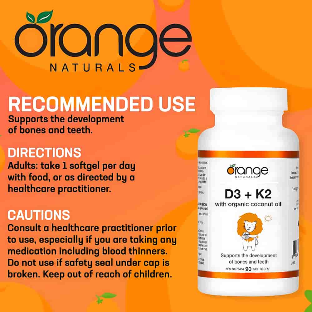Orange Naturals Vitamin D3+K2 is a dietary supplement formulated to support bone and teeth health, reduce the risk of osteoporosis, and maintain muscle function. Each softgel contains 1000 IU of vitamin D3 (cholecalciferol) and 120 mcg of vitamin K2, suspended in organic coconut oil for enhanced absorption. Vitamin D3 aids in calcium absorption, while vitamin K2 directs calcium to the bones and prevents its accumulation in the arteries. This product comes in a bottle of 90 easy-to-swallow softgels. It is recommended to take one softgel daily, preferably with a fat-containing meal, or as directed by a healthcare professional. It's important to consult a healthcare provider before using this product, especially if you are pregnant, nursing, or taking anticoagulant medications.