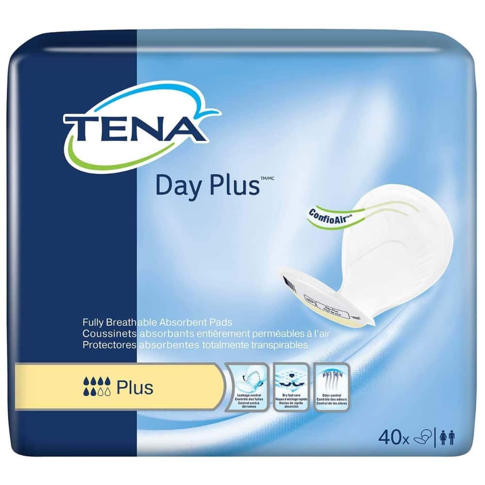 TENA Day Plus Incontinence Pads, heavy absorbency, yellow, are designed to provide reliable protection against moderate to severe urine and/or fecal leakage. These extra-long, bowl-shaped pads offer excellent leakage security and a snug, close body fit. The contoured core rapidly locks in liquid, ensuring dryness, while the fully breathable ConfioAir technology helps maintain the skin's natural moisture balance. These pads are designed to be used with TENA ProSkin Comfort Pants, providing comfort and confidence throughout the day.