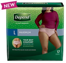 Depend: Women’s Underwear - Maximum Absorbency. New beautiful designs, same Trusted Protection Our fastest absorbing material for dry, comfortable incontinence protection Ultra soft fabric that moves with you. Comfortable leg elastics to help prevent leaks.