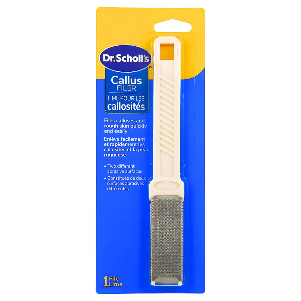 Dr. Scholl's Callus Filer is a tool designed to quickly and effectively remove calluses and hardened skin from your feet. It features a durable, washable stainless steel head, which offers two different abrasive surfaces to suit various skin care needs. Its ergonomic handle makes it easy to grip and allows you to reach difficult areas comfortably. To use, it is recommended to soak your feet and dry them completely before running the file over the callus or hardened skin in a single direction, using repetitive motions. After filing, it is advisable to apply a moisturizer or protective pad for added comfort and protection.