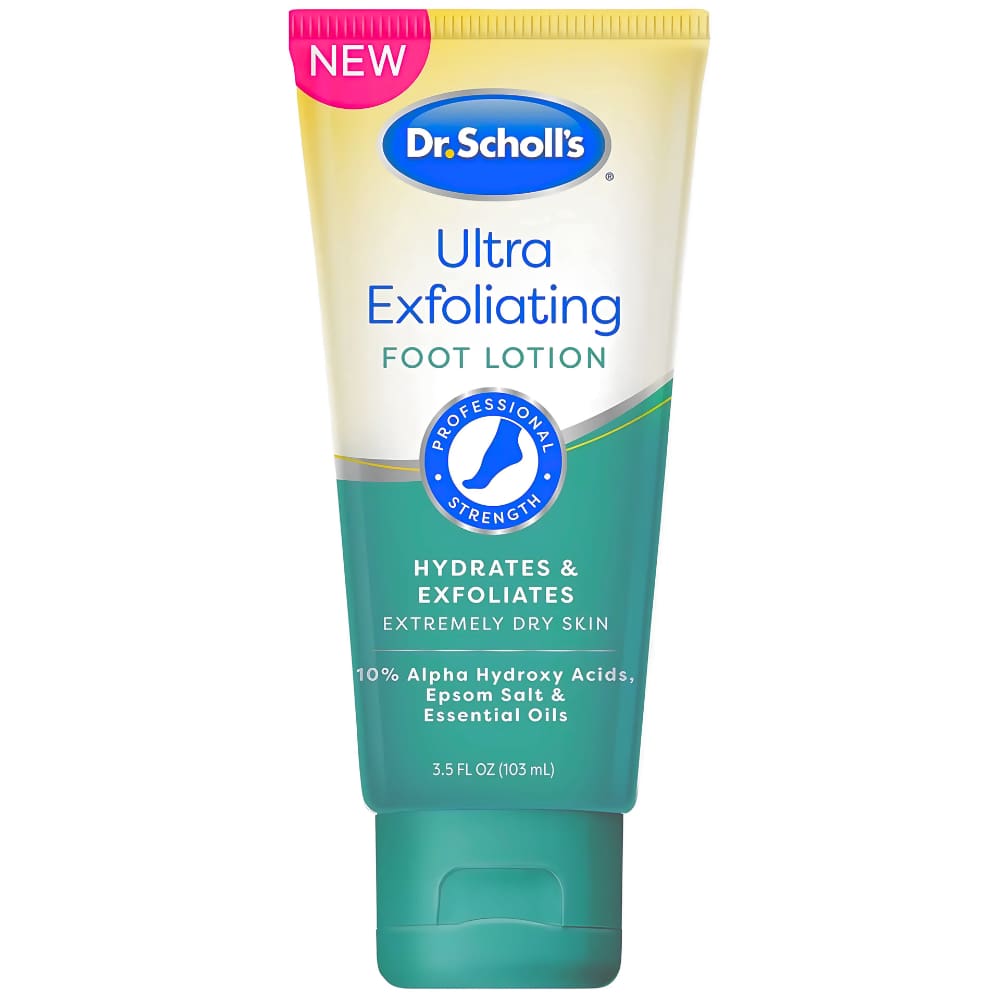 Dr. Scholl's Ultra-Exfoliating Foot Lotion is a professional-strength formula designed to hydrate and gently exfoliate thick, callused skin on the feet. It contains a proprietary blend of ingredients, including 10% alpha hydroxy acids, Epsom salt, and essential oils, which work together to reveal new, smooth, healthy skin.