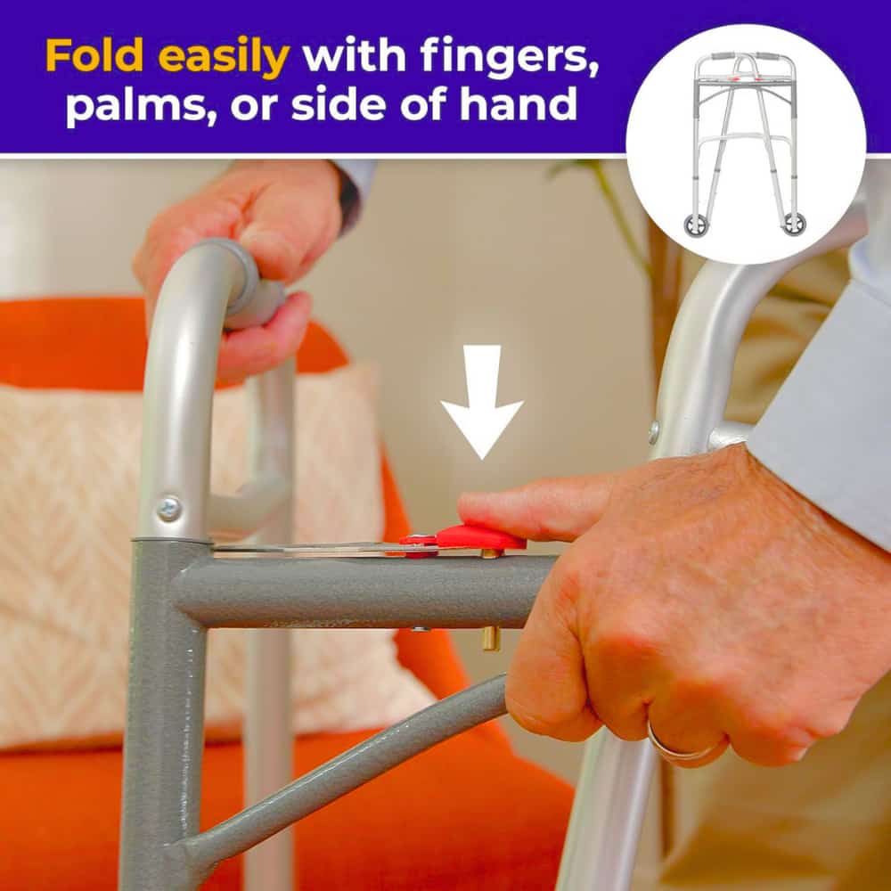 Easy push-button mechanisms may be operated by fingers, palms or side of handEach side operates independently to allow easy movement through narrow spaces and greater stability while standingSturdy 1" diameter aluminum construction ensures maximum strength while remaining lightweightNewly designed rear glide cap allows for walker to slide easily and smoothly over most surfacesVinyl-contoured hand gripComes with wheelsWeight Capacity350 lbsWidth17" inside hand gripHeight32"-39"