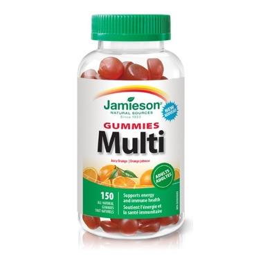 Jamieson: Multi Gummies Adults. Jamieson Multivitamin Gummies for Adults are a source of vitamins A, B3, B5, B6, B12, C, D3, E, Biotin and Folic acid plus important minerals. These delicious, all-natural gummies provide nutritional support to your daily vitamin needs. Features: Supports a healthy immune system Natural energy support All-natural and great tasting orange flavoured gummies Free from artificial colours, flavours and aspartame Dosage: Chew 2 gummies daily with a meal. Take a few hours before or after taking other medications Ingredients: Vitamins: Vitamin A (Palmitate) 300 mcg RAE/1000 IU Vitamin B3 (Niacinamide) 8 mg Vitamin B5 (Calcium d-Pantothenate) 6 mg Vitamin B6 (Pyridoxine HCl) 1.4 mg Vitamin B12 (Cyanocobalamin) 5 mcg Vitamin C (Ascorbic acid) 15 mg Vitamin D3 (Cholecalciferol) 7.5 mcg/300 IU Vitamin E (d-alpha tocopheryl acetate) 6 mg AT/8.9 IU Biotin 37.5 mcg Folate (Folic acid) 100 mcg Minerals: Iodine (Potassium iodide) 40 mcg Zinc (Citrate) 2.5 mg Also Contains Glucose syrup, sucrose, gelatin (bovine), sorbitol, citric acid, agar, natural orange flavour, Brazilian palm tree wax, vegetable oil, natural colours (annatto, caramel)