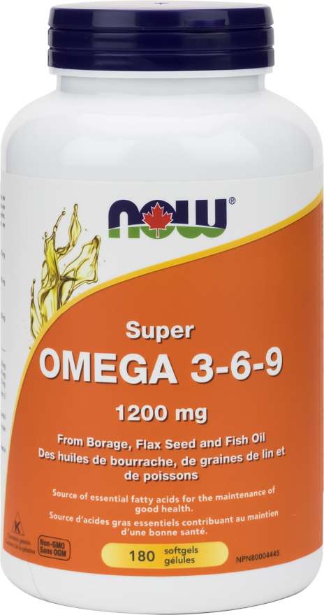 NOW: Super Omega 3-6-9 1200 mg Softgels. from Borage, Flax Seed & Fish Oils Super Omega 3-6-9 is a blend of fish, borage and flax seed oils. This combination of well-known nutritional oils has a unique balance of omega-3 and omega-6 essential fatty acids plus omega-9, a non-essential, but useful fatty acid.* The omega-3's, alpha linolenic acid, EPA and DHA, and the omega-6, GLA, are necessary for the maintenance of healthy skin, normal immune system balance, and proper nervous system function.* From the FDA: Supportive but not conclusive research shows that consumption of EPA and DHA Omega-3 fatty acids may reduce the risk of coronary heart disease. The fish oil concentrate used in this softgel is manufactured under strict quality control standards. It is tested to be free of potentially harmful levels of contaminants (i.e. mercury, heavy metals, PCB’s, dioxins, and other contaminants). Naturally occurring fatty acids (example) (per serving)**: Omega-3 Fatty Acids 604 mg (EPA: 126 mg; DHA 78 mg) Omega-6 Fatty Acids 539 mg (GLA: 160 mg) Omega-9 Fatty Acids 225 mg ** subject to natural variability Natural color variation may occur in this product. Suggested Use: Take 2 softgels daily with food. Store in a cool, dry place after opening. Supplement Facts Serving Size: 2 Softgels Servings Per Container: 90 Amount per Serving % Daily Value ** Percent Daily Values are based on a 2,000 calorie diet. † Daily Value not established. Calories 25 Total Fat 2.5 g 3%** Saturated Fat <0.5 g 2%** Polyunsaturated Fat 1.5 g † Monounsaturated Fat 0.5 g † Protein < 1 g 1%** Borage Oil (Seed) 800 mg † Fish Oil Concentrate 800 mg † Organic Flax Seed Oil 800 mg † Other Ingredients: Softgel Capsule [bovine gelatin (BSE-free), glycerin, water] and d-alpha Tocopherol. Contains fish (anchovies, sardines, tuna). d-alpha Tocopherol from non-GMO soy. Not manufactured with yeast, wheat, gluten, milk, egg or shellfish ingredients. Produced in a GMP facility that processes other ingredients containing these allergens. Caution: For adults only. Consult physician if pregnant/nursing, taking medication, or have a medical condition. Keep out of reach of children. The fish oil concentrate used in this softgel is manufactured under strict quality control standards. It is tested to be free of potentially harmful levels of contaminants (i.e. mercury, heavy metals, PCB’s, dioxins, and other contaminants). Naturally occurring fatty acids (example) (per serving)**: Omega-3 Fatty Acids 604 mg (EPA: 126 mg; DHA 78 mg) Omega-6 Fatty Acids 539 mg (GLA: 160 mg) Omega-9 Fatty Acids 225 mg ** subject to natural variability Natural color variation may occur in this product. Store in a cool, dry place after opening. Fish oil is product of Peru, Morocco, Thailand, China. Family owned since 1968.