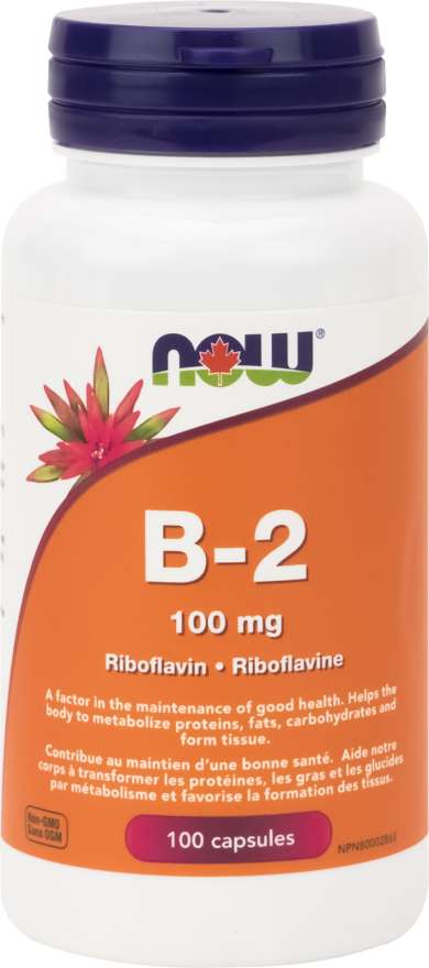 NOW: Vitamin B2 100 mg. Maintains Good Health Helps metabolize proteins, fats, carbohydrates Aids tissue formation Capsule delivery improves absorption Vitamin B-2, also known as Riboflavin, is a member of the B-vitamin family. Because food processing depletes many naturally occurring nutrients, supplementation is key to insure adequate intake of this important vitamin. NPN 80002865 Suggested Use: Take 1 capsule daily with a meal. Store in a cool, dry place after opening. Supplement Facts Serving Size: 1 Veg Capsule Servings Per Container: 100 Amount per Serving % Daily Value Riboflavin (Vitamin B-2) 100 mg 7692% Other Ingredients: Rice Flour, Hypromellose (cellulose capsule), Stearic Acid (vegetable source) and Silicon Dioxide. Not manufactured with wheat, gluten, soy, milk, egg, fish, shellfish or tree nut ingredients. Produced in a GMP facility that processes other ingredients containing these allergens. Caution: For adults only. Consult physician if pregnant/nursing, taking medication, or have a medical condition. Keep out of reach of children. Natural color variation may occur in this product. Store in a cool, dry place after opening. Family owned since 1968.