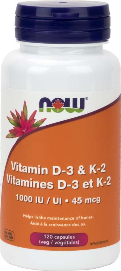 NOW: Vitamin D-3 & K2 Veg Capsules. PRODUCT DESCRIPTION Helps in the development and maintenance of bones and teeth Critical bone building nutrients Vit D3 1,000 IU / Vit K2 45 mcg NOW® combines two nutrients extensively researched for their contribution to the health of bones and teeth. Vitamin D3 promotes calcium transport and absorption. Vitamin K is critical for the formation of a healthy, strong bone matrix. Vitamin K2 is a readily active and biologically available form of Vitamin K. NPN 80006493 Adult Dosage: Take 1 capsule daily with meals. Each capsule contains: Vitamin D-3 (as cholecalciferol) 25 mcg (1000 IU) Vitamin K-2 (as Menaquinone-4)(MK-4) 45 mcg Non-Medicinal Ingredients: Rice Flour, Veg Capsule (hypromellose, water), Ascorbyl Palmitate, Silica.