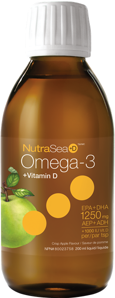 NutraSea: Omega-3 +D. You'll enjoy the clean, light taste of NutraSea+D premium quality liquid omega-3, in a delicious crisp apple or grapefruit-tangerine flavour, with no fishy burp-back. With its balanced ratio of 750 mg EPA and 500 mg DHA + 1000 IU Vitamin D per dose, NutraSea+D is an easy way to get your omega-3 and vitamin D and is a great choice for anyone looking for a pure and balanced omega-3. NutraSea+D supports the maintenance of good health, cardiovascular health and cognitive & brain function. It also helps support the development of the brain, eyes and nerves in children and helps in the development and maintenance of bones and teeth.