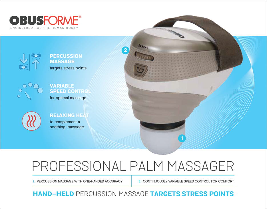 ObusForme: Palm Massager. The Professional Palm Massager is a percussion massage with soothing heat designed for various areas of the body.