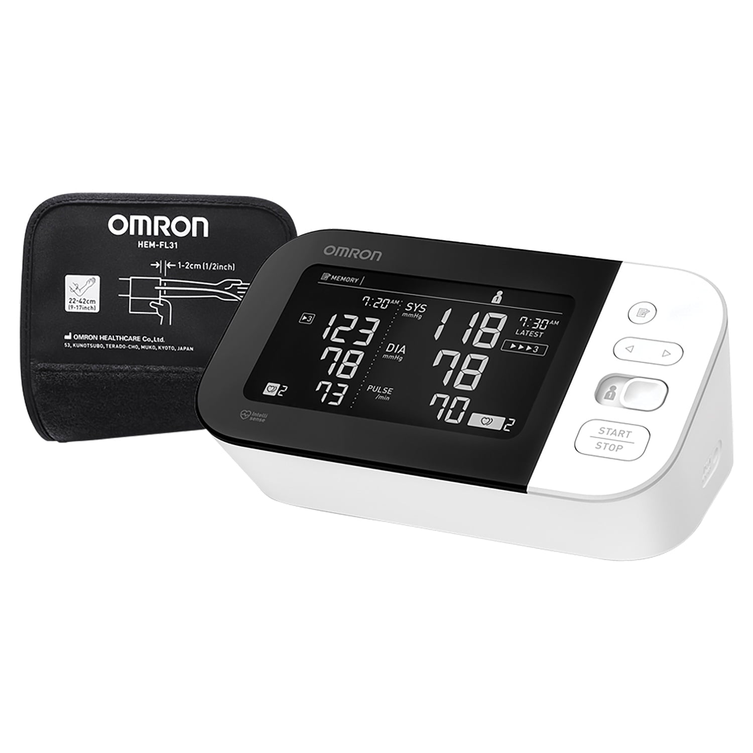 The OMRON BP7450 10‑Series Wireless Upper Arm Blood Pressure Monitor combines Advanced Accuracy technology—which collects five times more data points to reduce motion and breathing errors—with TruRead® technology that takes three customizable consecutive readings to deliver the averaged result. Its dual large backlit LCD displays current and previous readings side by side for immediate comparison. It stores up to 200 readings across two users (100 per user), and the hypertension indicator highlights high readings (≥ 130/80 mmHg). The pre‑formed Easy‑Wrap ComFit cuff fits arms 9″–17″ for consistent placement, and Bluetooth syncing with the free OMRON Connect app (iOS/Android) enables unlimited cloud storage, graphing, trend tracking, and Amazon Alexa integration. Irregular heartbeat alerts, included AC adapter, and AA batteries round out this feature‑rich, physician‑level home monitor.