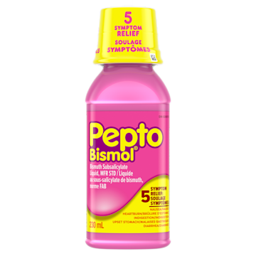 Pepto-Bismol: Original Liquid. When you have stomach troubles, Pepto’s improved formula coats your stomach and provides fast relief from nausea, heartburn, indigestion, upset stomach, and diarrhea. Relieves traveler’s diarrhea, diarrhea, and upset stomach due to overindulgence in food and drink including: heartburn, indigestion, nausea, gas, belching, and fullness.