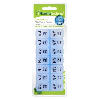 PharmaSystems: Twice Daily Pill and Vitamin Planner. Fourteen compartments – two for each day of the week Helps plan weekly medication, vitamins and supplements, twice daily Each compartment is bilingually labeled with raised lettering Compartments are contoured for easy pill removal Translucent design – easily view contents Assorted colours available for multiple users in a single household BPA free Measures: 5.25" L x 2.25"W x 1"D