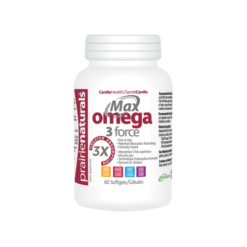 Prairie Naturals: MaxOmega-3-Force. One-A-Day Omega 3. MaxSimil® – Patented Omega-3 fish oil. 100% pure fish oil from wild sardines and anchovies. Delivers absorption ready pre-digested monoglyceride-rich omega-3 fatty acids. No dilution and no additional ingredients or excipients. Smaller softgel; easier to swallow. Clinically tested. MaxOmega-3-Force: 3X better absorption! Do you know your Omega-3 index? More than 50% of North Americans are taking Omega 3 supplements but do not know if they are actually absorbing their supplement. 20% of the population are exposed to digestive health issues due to age, health or medication that impede nutrient absorption. Prairie Naturals MaxOmega-3-Force uses the MaxSimil® enzymatic process that pre-digests Omega3 and delivers a readily absorbable and self-emulsified, monoglyceride-rich oil. MaxSimil® Omega-3 monoglycerides can be directly absorbed into the small intestine with no digestion required. MaxSimil® is clinically shown to increase the absorption of EPA and DHA by 3 times* Clinical data shows an improvement in the Omega-3 index with just one softgel per day of MaxSimil® patented Omega-3 fish oil. Recommended Use (Adults): Source of omega-3 fatty acids (eicosapentaenoic acid (EPA) and docosahexaenoic acid (DHA) for the maintenance of good health. Fish Oil helps support cognitive health, brain function and (healthy) development of brain, eyes and nerves in children up to 12 years of age. Fish Oil helps maintain cardiovascular health and reduce serum triglycerides. Recommended Dose (Adults & Children): Take 1 absorption-ready, pre-digested, omega 3 fatty acids softgels daily, or use as directed by your healthcare practitioner. Medicinal Ingredients: MaxSimil® Fish Oil Concentrate – 805 mg (anchovy, sardine and/or mackerel) Total Omega-3 Fatty Acids – 526 mg EPA (eicosapentaenoic acid) – 320 mg DHA (docosahexaenoic acid) – 185 mg Non-Medicinal Ingredients: Citrus medica limonum (lemon) peel oil, gelatin, glycerin, mixed tocopherols concentrate, purified water. Do not use if tamper seal is damaged. Keep closed in a cool, dry place out of reach of children.