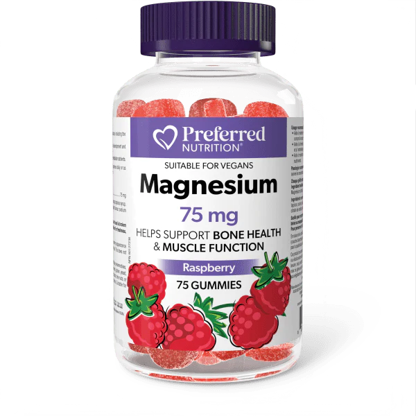 Preferred Nutrition: Magnesium 75 mg Gummies. Preferred Nutrition Magnesium provides a highly absorbable form of magnesium delivered in delicious, raspberry-flavoured, vegan gummies. Magnesium is an essential mineral that helps maintain normal muscle function, bone development, and energy metabolism. Each gelatin-free gummy contains 75 mg of magnesium, making it a convenient and tasty way to supplement your magnesium intake. Supports proper muscle function, including the heart muscle Helps in the development and maintenance of bones and teeth Helps in energy metabolism and tissue formation Provides a source of magnesium to help prevent magnesium deficiency Suitable for vegetarians and vegans