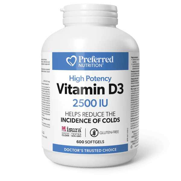 Preferred Nutrition: Vitamin D3 2500 IU Softgels. Preferred Nutrition Vitamin D3 2500 IU is a high-potency vitamin D supplement to help prevent vitamin D deficiency. Just one softgel per day provides 2500 IU of vitamin D3 in the preferred cholecalciferol form. This very important fat-soluble vitamin is offered in easy-to-swallow softgels and formulated with flaxseed oil for enhanced absorption. Helps prevent vitamin D deficiency Vitamin D intake, when combined with sufficient calcium, a healthy diet, and regular exercise, may reduce the risk of developing osteoporosis in people with vitamin D deficiency Helps reduce the incidence of upper respiratory tract infections (URTIs) or colds in individuals with vitamin D deficiency Provides 2500 IU of vitamin D3 in the preferred cholecalciferol form