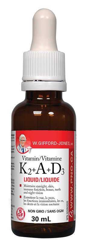 Preferred Nutrition: Vitamin K2+A+D3 Liquid. The combination of vitamins K and D has been shown to significantly increase bone mineral density (BMD) better than either alone. Vitamin D has also been shown to increase bone density and to reduce hip fracture by 43-60%. People with the highest vitamin D levels are 36% less likely to have macular degeneration. Vitamin A deficiency may cause, and supplementation may improve, night blindness. Vitamins D and A are also good for your skin. Vitamin D can help adults with low levels of D and children treat eczema, and high-dose vitamin A has been shown to prevent acne. Vitamin K supports activation of proteins involved in tooth mineralization. People with the highest levels of D have 30% less risk of gingivitis. Vitamin D also helps periodontal disease because men with the highest levels of D have 39% less bone loss and women have 26% less: supplementation with vitamin D reduces bone loss.