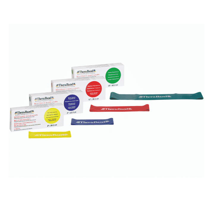Remington Medical: Thera-Band Resistance Loops. TheraBand Resistance Band Loops are continuous 3″ wide loop elastic bands used for a variety of applications, particularly lower body Exercise to increase strength and balance. The band loops are an effective and efficient way to to strengthen muscles and has the added benefits of convenience, portability, and eliminates the need to tie traditional bands, thus prolonging life and reducing additional wear. The band loops come in four resistance levels, including yellow, red, green, and blue and are available in three lay flat lengths of 8″, 12″ and 18″. 3 inch wide continuous loop elastic bands are an effective way to improve strength & flexibility in glutes, knees and hips The continuous loop provides a comfortable alternative to tying flat resistance bands into loops, helping eliminate wear and tear Convenient and portable product that can be used in the clinic, at-home, or on-the-go Four color-coded resistance levels are available for the 8, 12, and 18 inch sizes