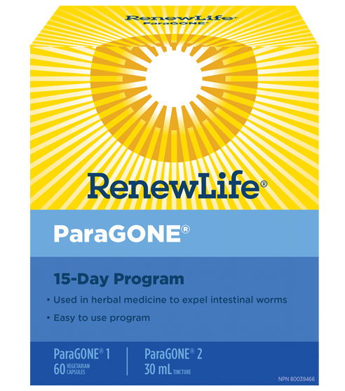 Renew Life®: ParaGONE®, 15 Day Anti-Parasite Cleansing Program. An ideal intestinal cleanse for those who have a parasite infection and are looking to improve digestive function, Renew Life® ParaGONE® Kit is a two-part, 15-day anti-parasite and natural herbal cleansing program. Contains antifungal herbs and extracts that have been traditionally used to remove parasites from the body and improve digestive function. PARASITE TARGETED: ParaGONE® is a powerful parasite cleansing formula containing natural ingredients that are proven to eliminate parasites from the body. HERBAL INGREDIENTS: ParaGONE Part I vegetable capsules contain a mixture of unique herbal ingredients that are used in Herbal Medicine to expel parasites or intestinal worms, including wormwood leaf, quassia wood, garlic bulb, and thyme leaf. ParaGONE Part II is a liquid tincture that includes nature’s vermifuge wormwood leaf and stem, along with black walnut hulls, clove bud, marshmallow root, and orange peel. SIMPLE 15 DAY PROGRAM: ParaGONE® is a 2-part anti-parasitic cleanse formulated to address both parasites and candida. NON GMO: This product does not contain genetically modified material. Contains no dairy, gluten, or soy. QUALITY CHECKED IN CANADA: All Renew Life Canada products go through a rigorous testing program. Directions: ake 2 capsules of ParaGONE® 1 with 250 ml of water and 1ml of ParaGONE® 2 in the morning. Take 2 capsules of ParaGONE® 1 with 250ml of water and 1ml of ParaGONE® 2 in the evening. Take 2 hours before or after taking other medications. NOTE: ParaGONE® 2 dropper dispenses 0.5ml when filled to line indicated. Consult a health care practitioner for use beyond 15 days. No refigeration required. Store in a cool dry place. Ingredients: ParaGONE® 1 contains (per capsule) Wormwood Leaf (Artemisia absinthium) 4:1 Extract (800 mg)200 mg Thyme Leaf (Thymus vulgaris) 4:1 Extract (520 mg)130 mg Caprylic Acid (Magnesium caprylate)75 mg Garlic Bulb (Allium sativum) 4:1 Extract (260 mg)65 mg Quassia Wood (Quassia amara) 4:1 Extract (240 mg)60 mg Clove Bud (Syzygium aromaticum)25 mg Pippali Seed (Piper longum)10 mg ParaGONE® 2 contains (per 1mL) Ingredients derived from a 3:1* (solvent : dry herb) ratio Black Walnut Hulls (Juglans nigra)125 mg Clove Bud (Syzygium aromaticum)50 mg Marshmallow Root (Althaea o cinalis)50 mg Orange Peel (Citrus sinensis)50 mg Wormwood Leaf and Stem (Artemisia absinthium)50 mg ParaGONE® 1 contains (per capsule) Non-medicinal Ingredients: Vegetable capsule (Hypromellose, water). Contains no sesame, mustard, wheat, gluten, yeast, egg, dairy, soy, seafood (fish, crustaceans, shellfish), animal products, artificial colour or unnecessary preservatives, binders or fillers. ParaGONE® 2 contains (per 1mL) Non-medicinal Ingredients: Filtered water, ethyl alcohol. Contains no sesame seeds, mustard, wheat, gluten, yeast, egg, dairy, soy, seafood (fish, crustaceans, shellfish), animal products, artificial colour or preservatives, binders or fillers. Allergen Warning: This product contains tree nuts (black walnut). Do not use this product if you have a tree nut allergy.