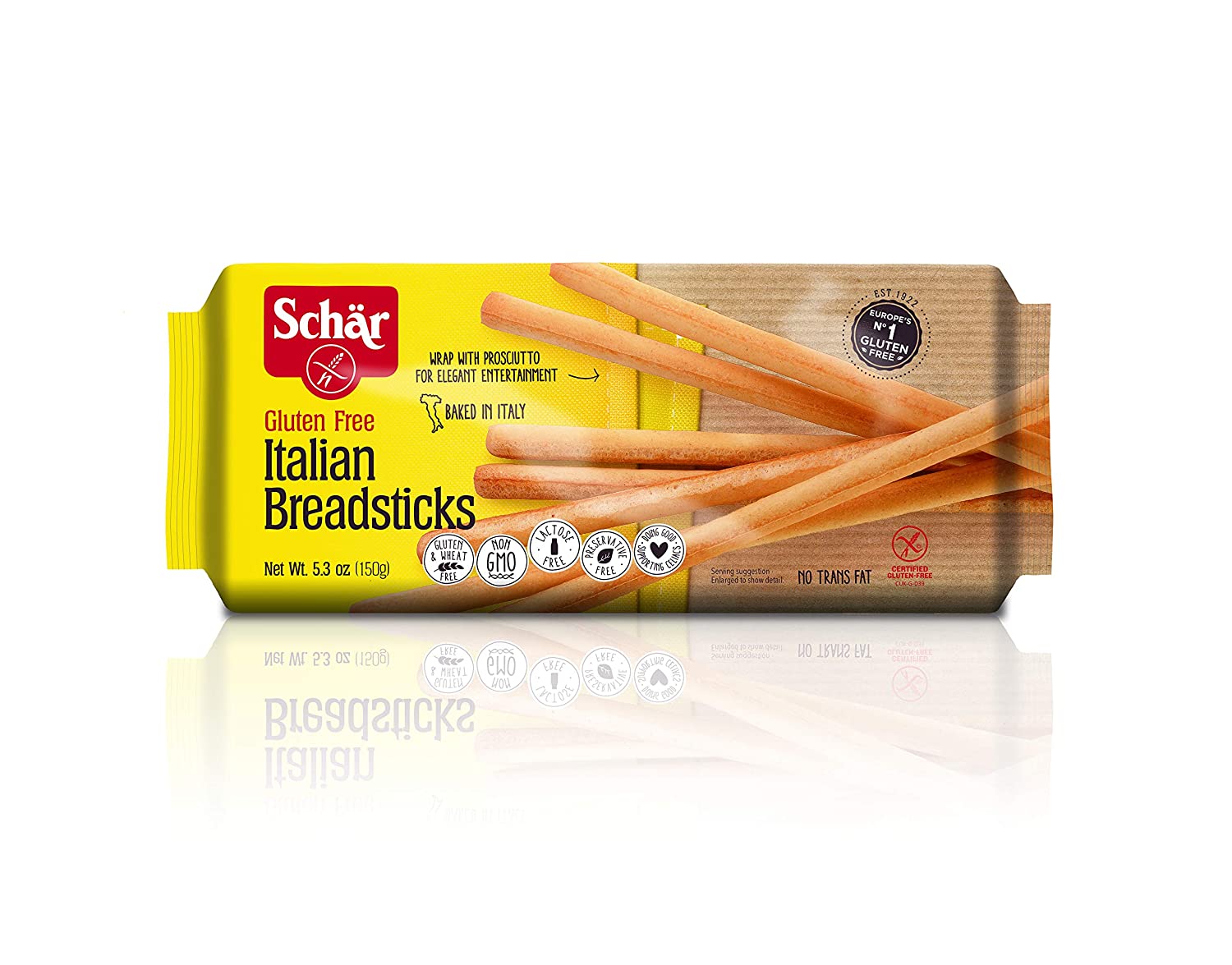 Schar: Breadsticks. Schär Gluten Free Italian Breadsticks are a tabletop staple that will complement any pasta dish or simply hold you over until dinner. These Certified Gluten-Free breadsticks are baked to a crisp, golden perfection. They’re free of lactose, wheat, GMOs and preservatives so everyone can enjoy your prosciutto-wrapped breadstick appetizers.