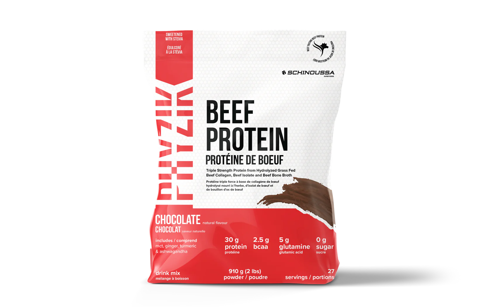 Schinoussa: Beef Protein. What it is? A triple strength source from grass fed beef collagen, beef isolate and beef bone broth. The added turmeric, ginger and ashwagandha may support gut heath, digestion, inflammation and hormone balance. All together, great for stress protection, muscle building and overall health. Who it's for? A protein source for those who have food sensitivities and look to a food based diet What it does? What's unique about it? As a complete amino acid profile, beef targets all aspects of the body. Supports muscle repair, growth, recovery while targeting ligament, tendons and joint health as well.