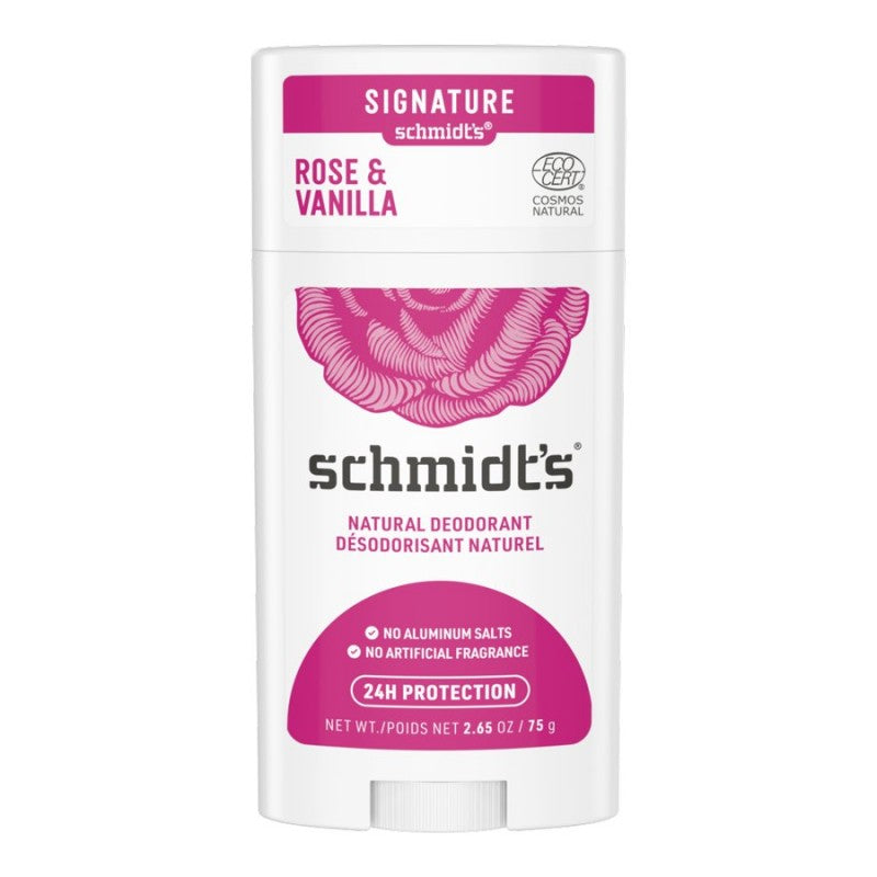 Schmidt's: Rose & Vanilla Deodorant. Schmidt's all natural Rose and Vanilla Deodorant Stick is scented with essential oils and is perfect for sensitive skin. Really Natural. Really Works. – Ecocert Certified Natural Deodorant, Schmidt's Rose & Vanilla helps neutralize odor and keeps you fresh with 24 hour odor protection. Certified 100% Natural Origin – Rose & Vanilla features a heavenly bouquet of roses with a hint of sweet, warming vanilla, made with essential oils. Proven Protection – Our award winning deodorants are unisex and have over 20,000 5-Star reviews*! We have a formulation or scent for everyone, so you can go natural with confidence. Fights Body Odor – 1-2 swipes is all you need for all day protection with just a small amount. Hold product momentarily to skin to soften on contact with body heat. Plant Based Ingredients – Formulated to be gentle on skin, using certified 100% natural origin ingredients such as shea butter, odor fighting magnesium, and essential oils. Our Never List – Our Natural Deodorants never contain aluminum salts, artificial fragrance, filler ingredients, propylene glycol, phthalates, or parabens. Ingredients: Maranta Arundinacea (Arrowroot) Powder, Sodium Bicarbonate (Baking Soda), Cocos Nucifera (Coconut) Oil, Butyrospermum Parkii (Shea) Butter, Caprylic/Capric Triglyceride (Fractionated Coconut Oil), Euphorbia Cerifera (Candelilla) Wax, Natural Fragrance, Simmondsia Chinensis (Jojoba) Seed Oil, Magnesium Hydroxide, Tocopherol (Vitamin E)