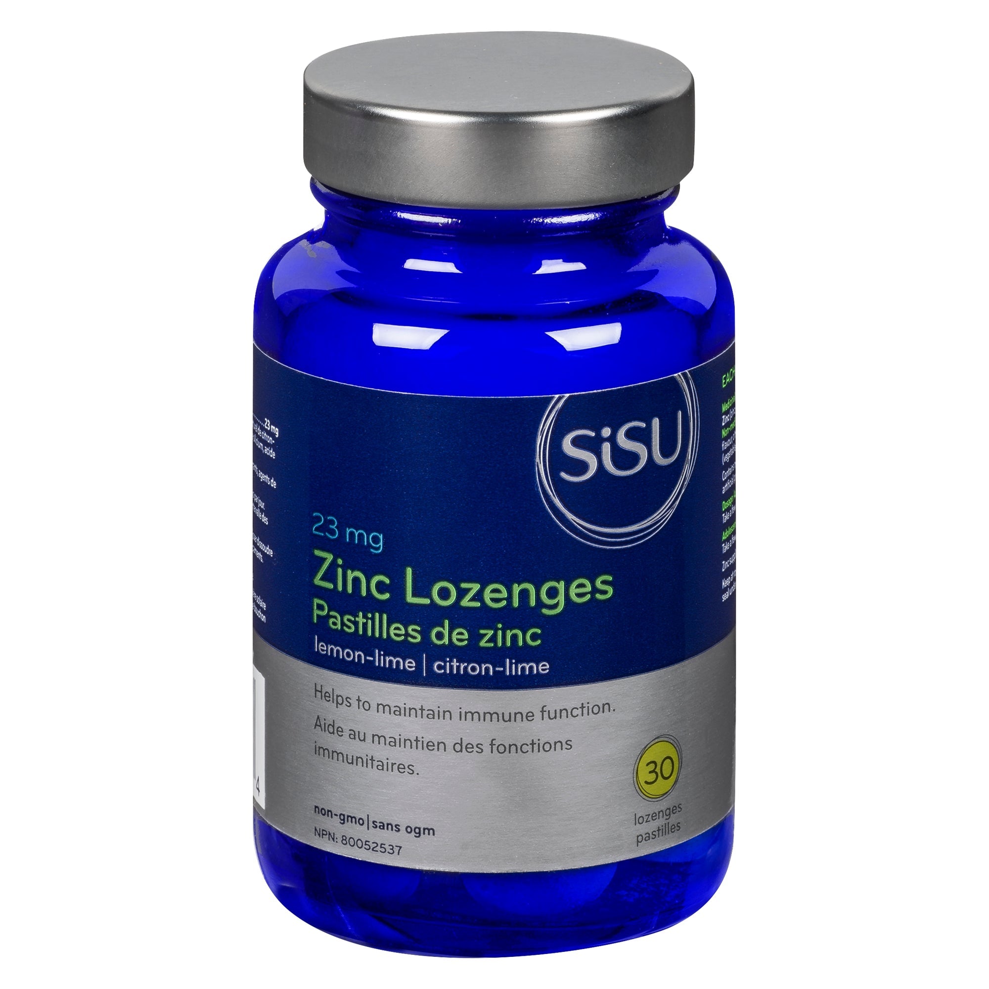 Sisu: Zinc Lozenges. 30 | Lozenges Naturally sweetened Sisu Zinc Lozenges provide high-potency zinc in a convenient, great-tasting lemon-lime lozenge. Suitable for adults and children ages 9 and up, these lozenges can be taken year-round for better hair, skin and nail health, or as additional support throughout the cold-and-flu season to boost the immune system and improve resistance to infection. Benefits Supports immune health Promotes clear skin and strong hair and nails Delicious, natural lemon-lime flavour Naturally sweetened Medical Ingredients Zinc (zinc citrate, zinc gluconate) 23 mg Non-medicinal ingredients evaporated cane sugar, natural lemon-lime flavour, citric acid, magnesium stearate (vegetable), silicon dioxide, stearic acid (vegetable), microcrystalline cellulose. Dosage Adults Take 1 lozenge one to two times per day. Dissolve in mouth.Take a few hours before or after taking other medications. Take with food. Dosage Adolescents (9-18 years) Take 1 lozenge one time per day. Dissolve in mouth. Take a few hours before or after taking other medications. Take with food.