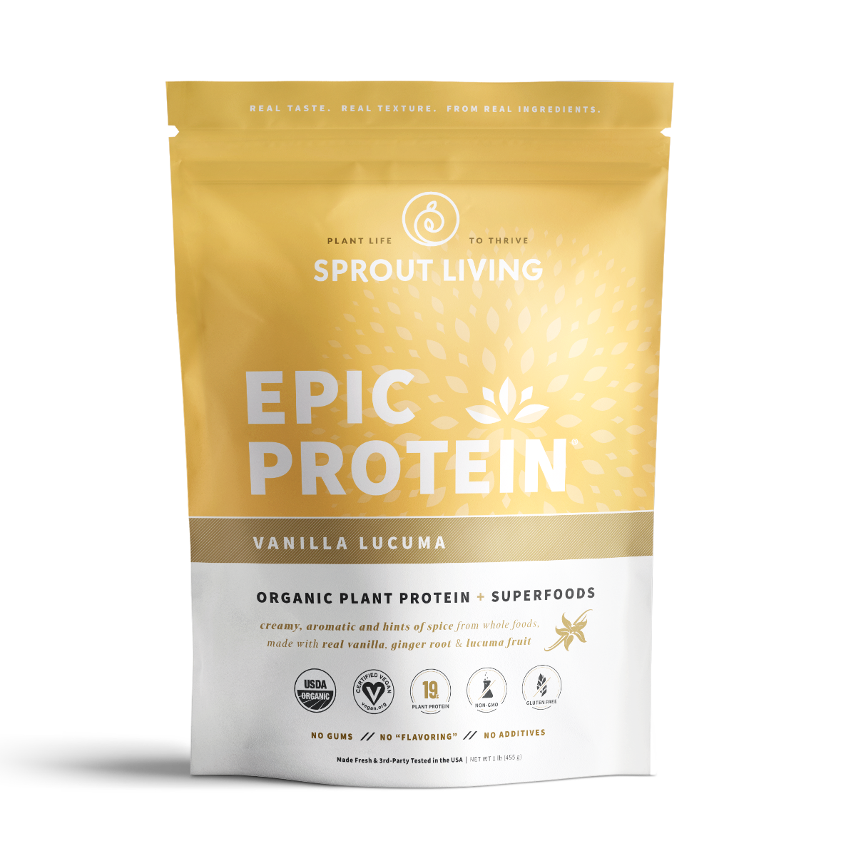 Sprout Living: Epic Protein Vanilla Lucuma. Epic Protein : Vanilla Lucuma is a thoughtful blend of organic plant protein, prebiotics and nutrient-dense superfoods. With absolutely no additives, it is the purest protein powder you can find • 19 g complete plant protein • Smooth texture with real flavors • Delicious vanilla bean, lucuma and other spices • No “natural” flavoring, gums or additives Ingredients: EPIC Protein Base (Yellow Pea, Sunflower Seed, Pumpkin Seed, Sacha Inchi, Cranberry Seed), Vanilla Lucuma Blend (Lucuma Fruit, Cinnamon, Ginger Root, Vanilla Bean), Coconut Crystals, Heirloom Red Banana, Jerusalem Artichoke, Baobab Fruit, Himalayan Pink Salt, Stevia Leaf