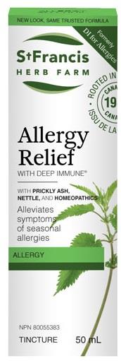 St. Francis: Allergy Relief. Natural allergy relief that is as effective as traditional over-the-counter products, without the side effects!* A uniquely powerful two-pronged allergy solution that provides symptom relief plus addresses the underlying cause of an overactive immune system without drowsiness or dryness side-effects The essential elements of our classic Deep Immune® formula plushomeopathic ingredients=the ideal combination of preventative and reactive healing strategies A potent array of homeopathic ingredients that specifically target immediate allergy symptoms Includes the key herbs in our Deep Immune formula The non-homeopathic herbal ingredients in Allergy Relief with Deep Immune® are Certified Organic or Wildcrafted. This formula is Non-GMO, Gluten Free, Soy Free, Corn Free, Lactose Free, and Vegetarian. Who It’s For: Those who want fast-acting relief of debilitating allergy symptoms such as sneezing, runny nose, congestion, itchiness, and watery eyes Those who also want to address the underlying cause of allergies, namely an imbalance of the immune system NPN: 80055383