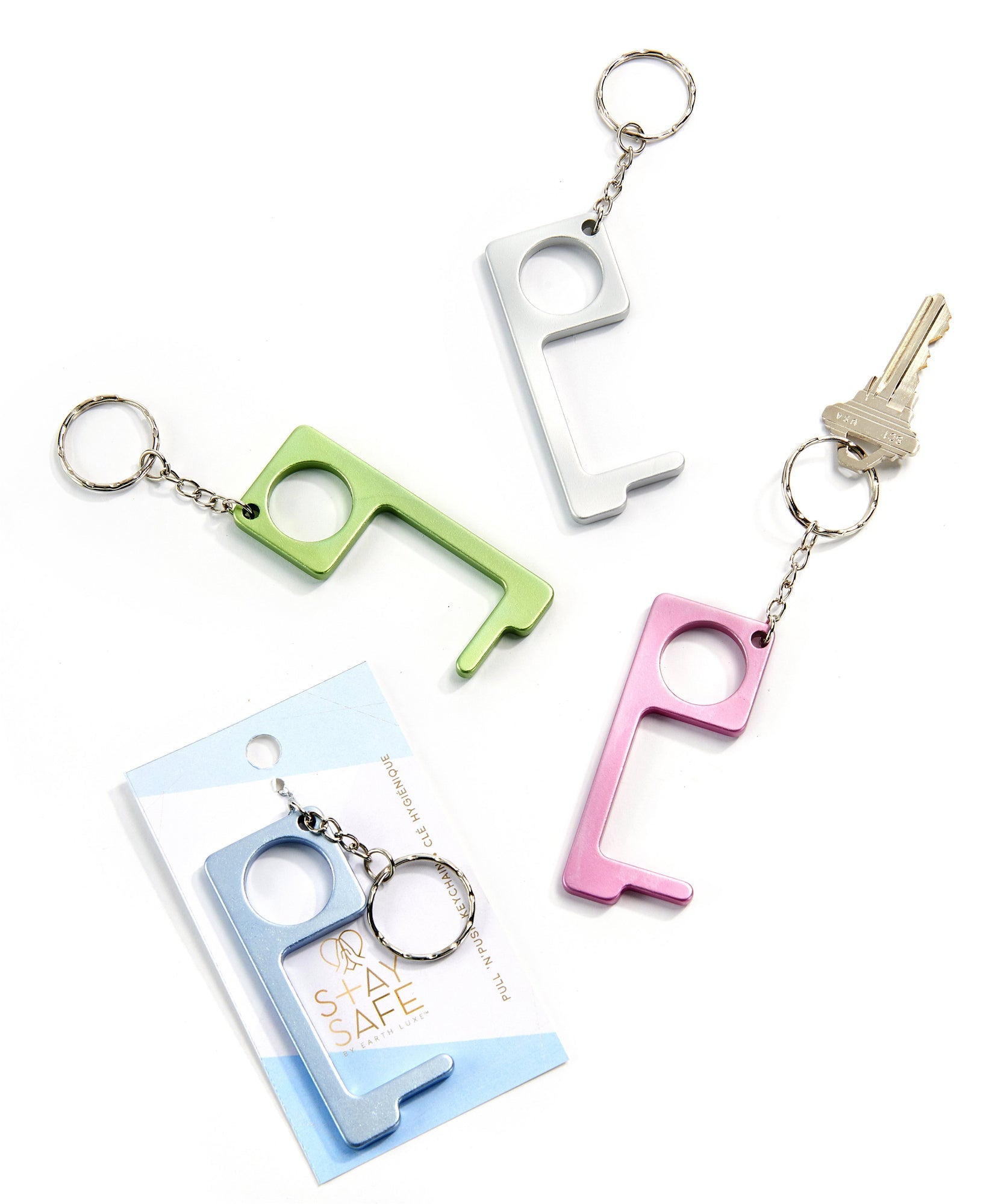 Stay Safe: Push/Pull Keychain. Push n' Pull multi-tool key chain is a handy gadget to help eliminate unnecessary contact with buttons, door handles, other objects. Available in 4 colors: Pink, Blue, Green, Light Grey. 24 pieces in a cardboard displayer (12x5.1x8.9) at no charge. Key chain (3x1.3). Hand wash, wipe with warm soapy water. Zinc Alloy.
