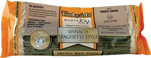 Tinkyada: Spinach Spaghetti. Pasta Joy Ready Cholesterol Free Low Fat Low Sodium Trans Fat Free See Back Panel For Nutritional Information Not Mushy! Promising a Delightful Eating Experience Product of Canada A Classic in Texture and Taste Whole Grain Kosher Certified- Kashruth Council of Toronto Wheat Free Gluten-Free Good Consistent Texture Al Dente No Preservatives Added
