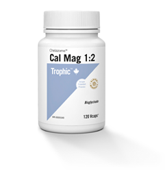 Trophic: Cal Mag Chelazome 1:2. Trophic’s patented Albion Calcium and Magnesium, chelated with natural amino acids, provides superior biological activity or bioavailability and absorption. By comparison, other compounds such as calcium gluconate, calcium citrate and calcium carbonate are poorly absorbed by the small intestine as these mineral salts must undergo a complex digestive and transportation process. Our formula helps to build and maintain strong bones and teeth and aids in metabolism, blood clotting, nerve transmission and regulation of heartbeat. Dietary calcium deficiency has also been associated with increased risk of hypertension, pre-eclampsia and colon cancer. Signs of magnesium deficiency include muscle tics and twitches, irregular heartbeat, convulsions, seizures, tremors and glandular disturbances. Ingredients: Medicinal Ingredients: Calcium bisglycinate …… 275 mg Providing Elemental Calcium…… 50 mg Magnesium bisglycinate/magnesium oxide …….. 550 mg Providing Elemental Magnesium ……. 100 mg Non-Medicinal Ingredients: Hypromellose, magnesium stearate. Directions: Adults, take 4 VcapsTM daily or as recommended by a healthcare practitioner. Take a few hours before or after taking other medications. Recommended Use: For the maintenance and development of healthy teeth and bones. Manufactured under the unique Albion Laboratories’ process (patented and patents pending) whereby the minerals are chelated by amino acids, peptides and polypeptides. No added yeast, wheat, soy, gluten, corn, sugar, dairy, artificial colors, preservatives or animal products.