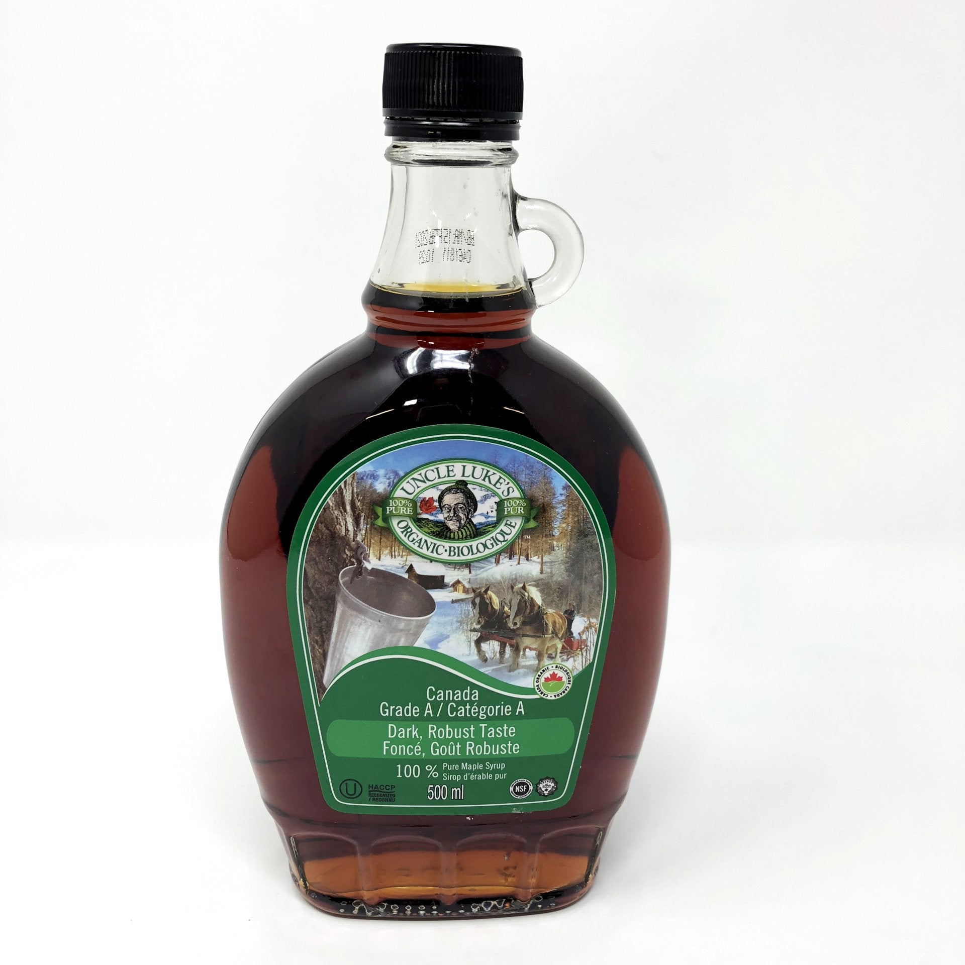 Uncle Luke's: Organic Maple Syrup Dark Robust Taste. Drizzle this organic maple syrup on your next batch of pancakes and watch as everyone's eyes light up. This darkly coloured 100% pure organic maple syrup contains no chemicals, preservatives or additives.