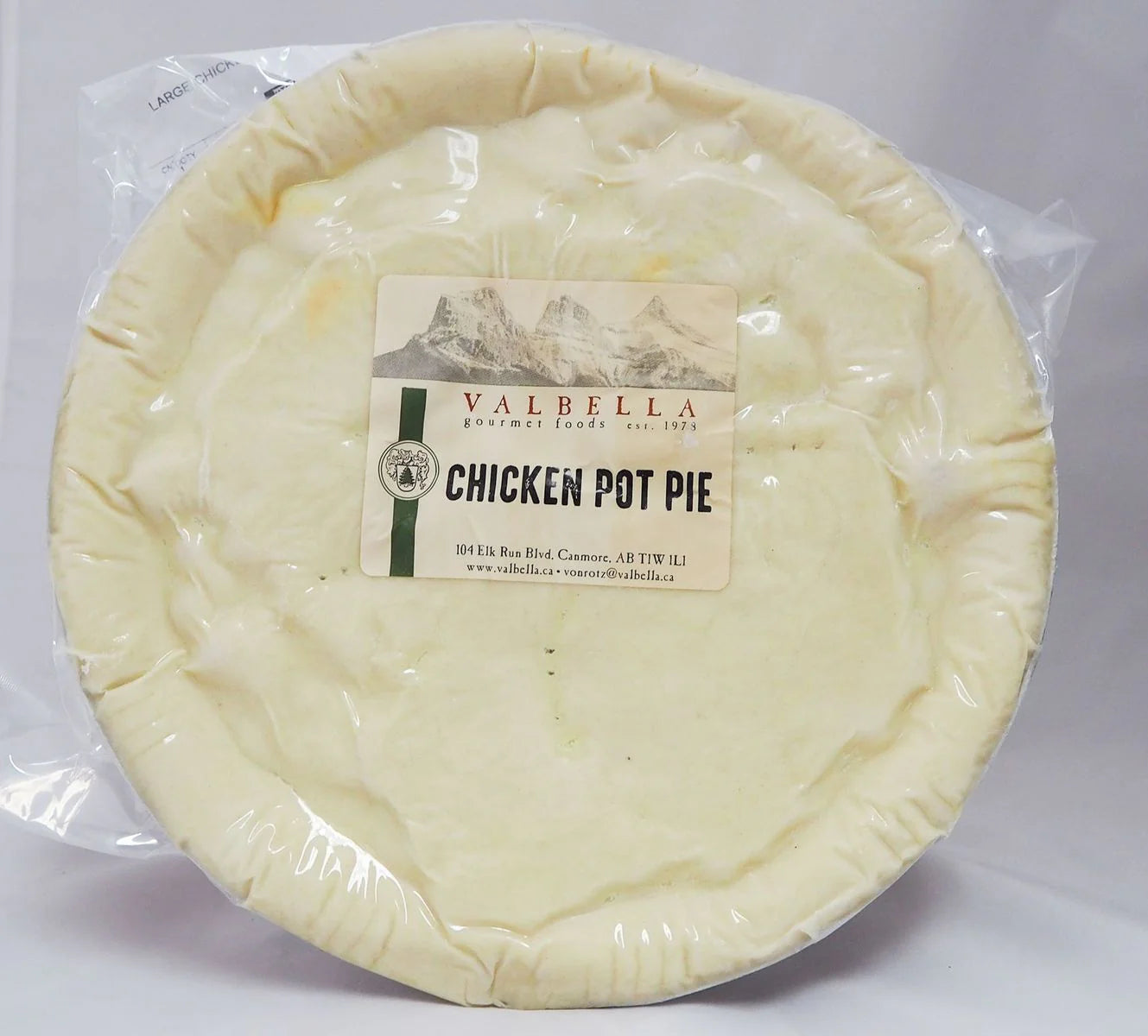 Valbella: Chicken Pot Pie. Delicious, and easy to make, this Valbella Chicken Pot Pie is a classic. Made with tender chunks of chicken, hearty vegetables, and delicious gravy, all nestled inside a flaky pastry crust. If you haven't tried it yet, you're missing out! Ingredients: Chicken, peas, carrots, celery, pie dough [flour (wheat), vegetable oil, corn starch, dextrose, salt, wheat starch, sodium bicarbonate, calcium propionate, sodium metabisulfate, soybean oil, l-cysteine hydrochloride, tricalcium phosphate, ascorbic acid amylase]. Contains egg.