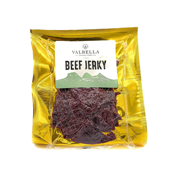 Valbella: Jerky. Our delicious Valbella Beef Jerky is smoked and dried, which makes it the perfect tasty snack for on-the-go energy or satisfying those midday cravings. Perfect for your next hike or Netflix movie marathon! Try it now! Beef jerky is thought to have originated in South America during the 1800s. The Quechua tribe, who were ancestors of the ancient Inca empire, produced a meat similar to beef jerky called ch'arki. Early explorers built smoke huts and hung cuts of meat over a fire to smoke cure the meat. Ingredients: Beef, salt, spices, brown sugar, sodium erythorbate, sodium nitrite, smoke flavour.