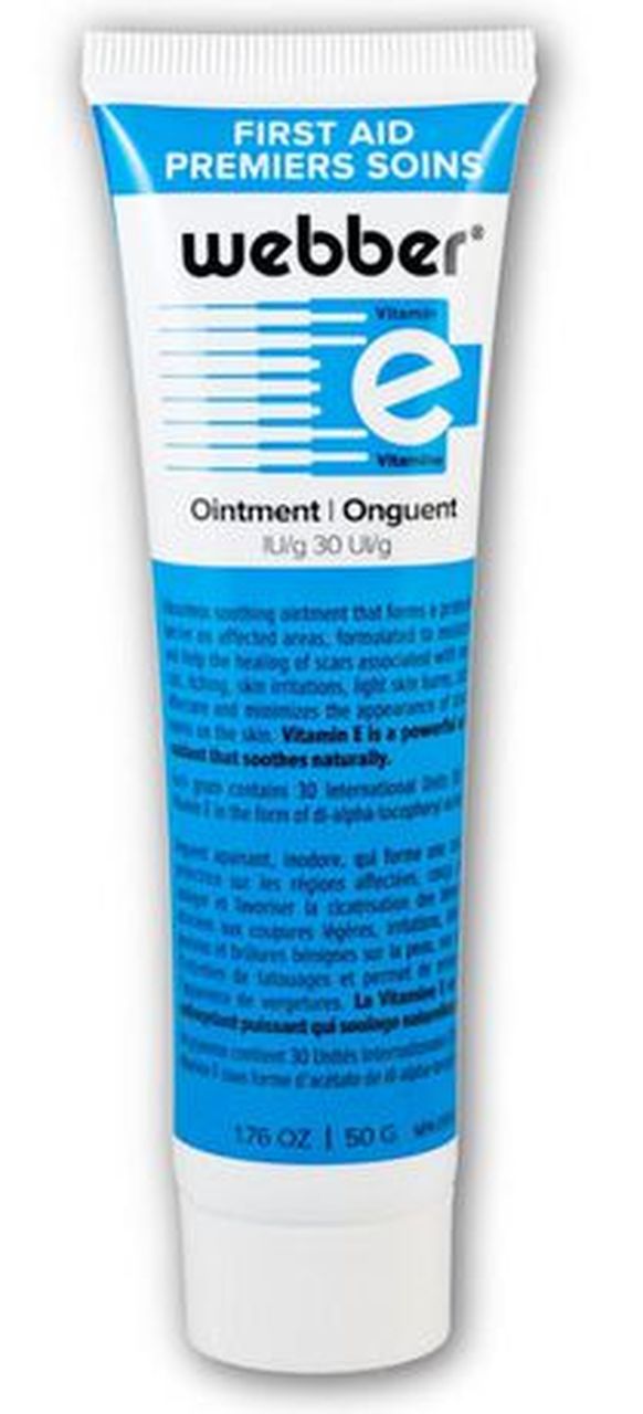 Webber: Vitamin E First Aid Ointment. Odourless soothing ointment that forms a protective barrier on affected areas, formulated to moisturize and help the healing of scars associated with minor cuts, itching, skin irritations, light skin burns, tattoo aftercare and minimizes the appearance of stretch marks on the skin.